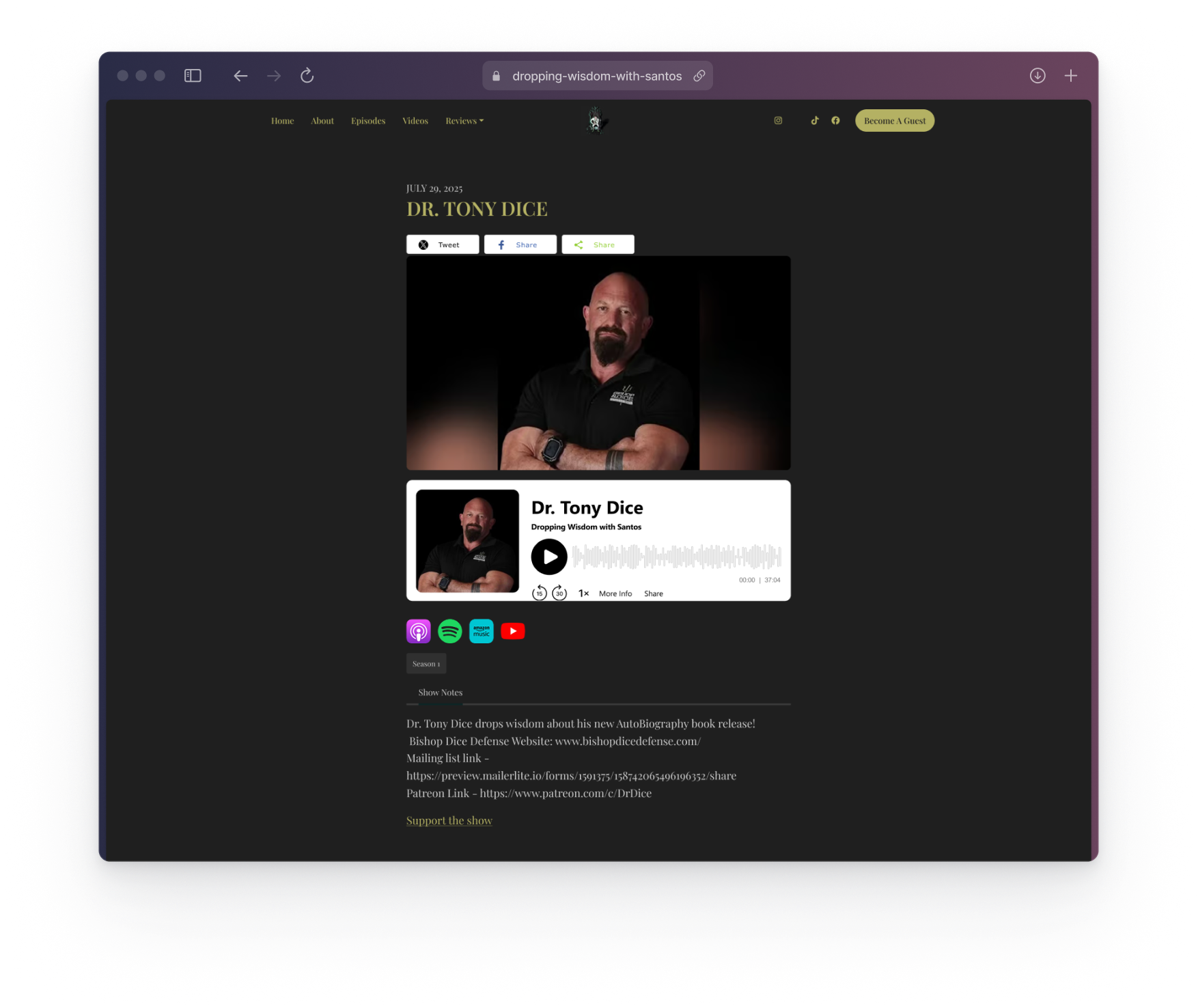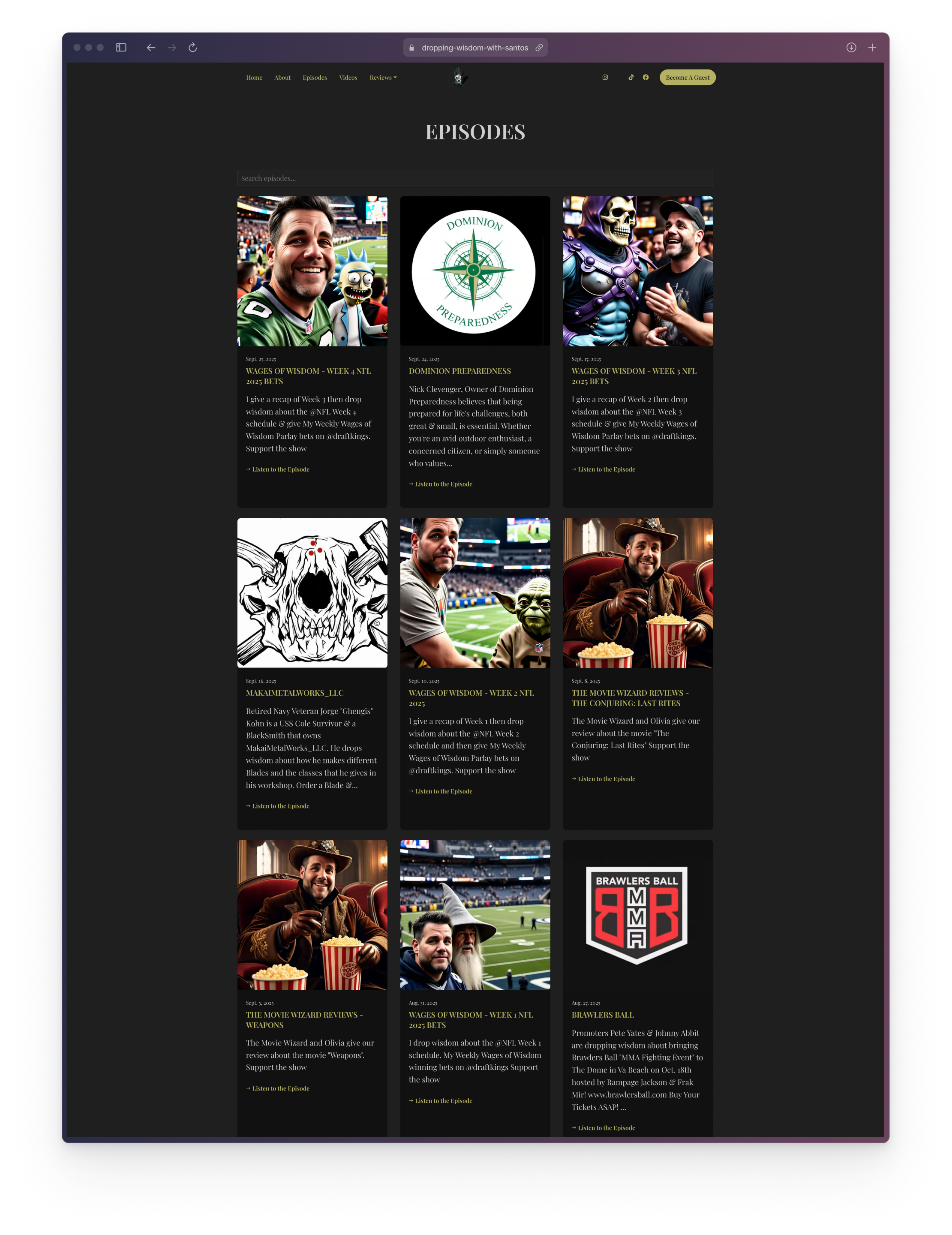 Dropping Wisdom With Santos is a conversational podcast centered on professional & paranormal experiences tied together with unscripted wisdom. The host wanted a digital presence that reflects the authenticity of his voice while providing listeners an easy way to explore episodes, subscribe, and engage.