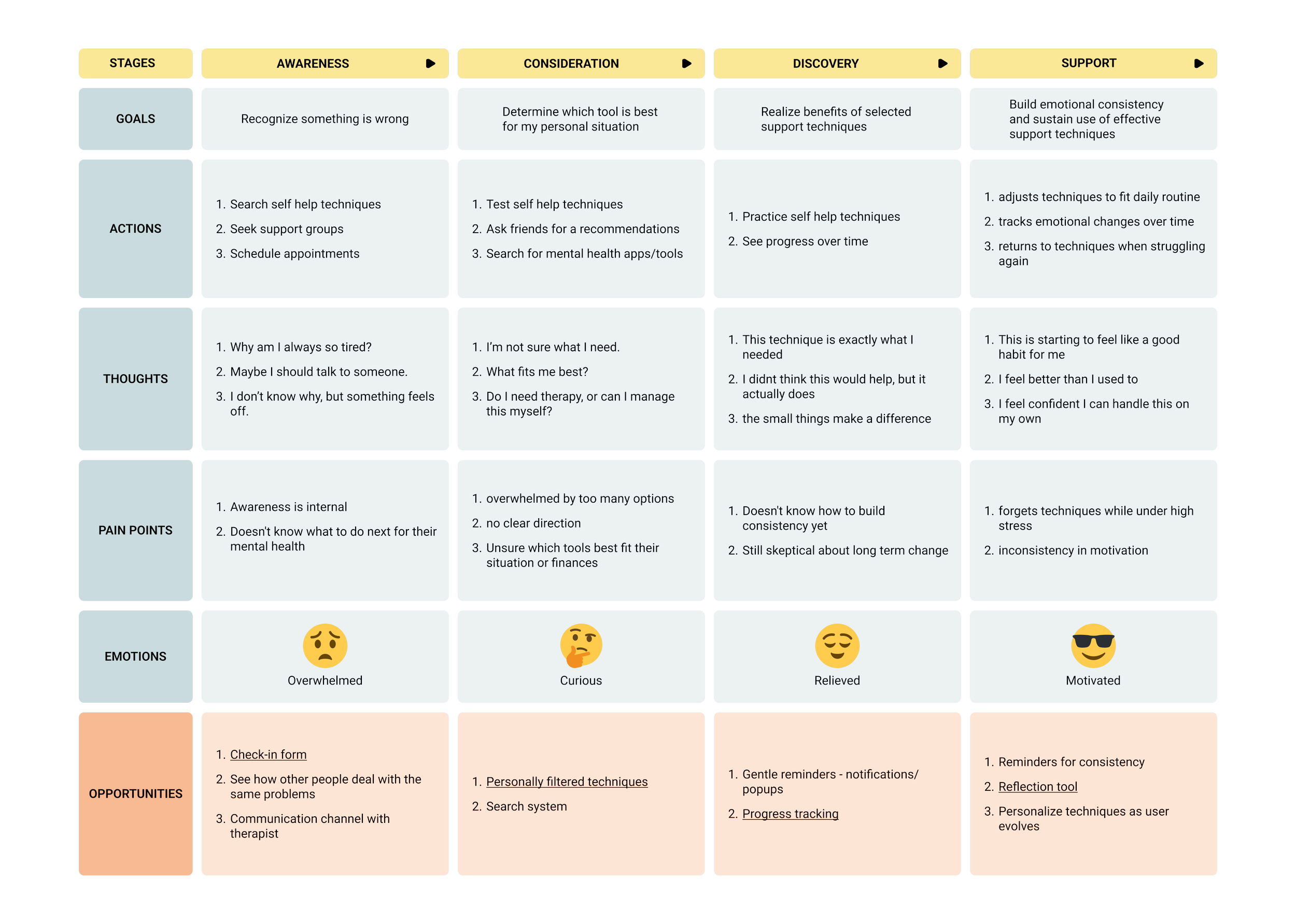 The journey map details the steps from emotional awareness to reaching the support users need. We used this to initially visualize the user's general experience with mental health tools.